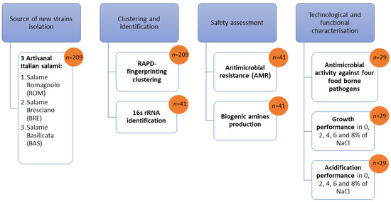 Summary of the screening procedure for isolation and characterization of new potential bioprotective starter lactic acid bacteria (n = number of isolates).