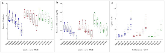 In the same samples analysed for the determination of the McFarland values, pH was also periodically monitored. In fact, the LAB metabolism increased the acidity, and the data were expressed as differences of pH with respect to the initial value. The curve obtained showed a behaviour similar to those obtained measuring the change of the turbidity on the McFarland scale. In this case, the results for the three parameters estimated with the Gompertz equation and obtained in relation to the isolation source and NaCl concentration are presented as a box and whiskers plot (Figure 2a–c).