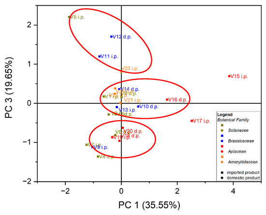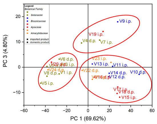 Chart of scores for PC3 vs. PC1 for PCA analysis, using as input data the content of trace elements for the analyzed vegetable samples.