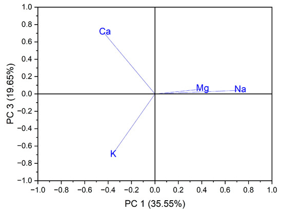 PCA analysis was carried out in two directions: the first for the classification of samples according to the origin of the botanical family to which they belong, and the second for the classification of samples according to the macro elements and trace elements evaluated. Using as input data the values of the macro elements (Na, K, Ca and Mg) for the 24 vegetables, the results are composed of three groups of vegetables, as follows: the first group is influenced by the content of the samples in Ca, the second group is influenced by the Mg and Na content, and the third group by the content of the vegetable samples in K. A grouping of samples could not be obtained on the basis of botanical origin.