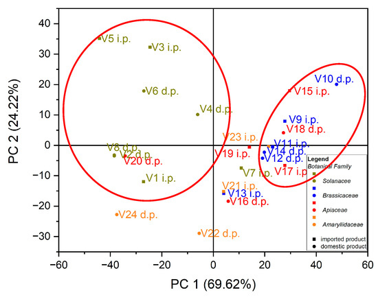 Chart of records of PC2 vs. PC1 for PCA analysis, using as input data the content of trace elements for the analyzed vegetable samples.