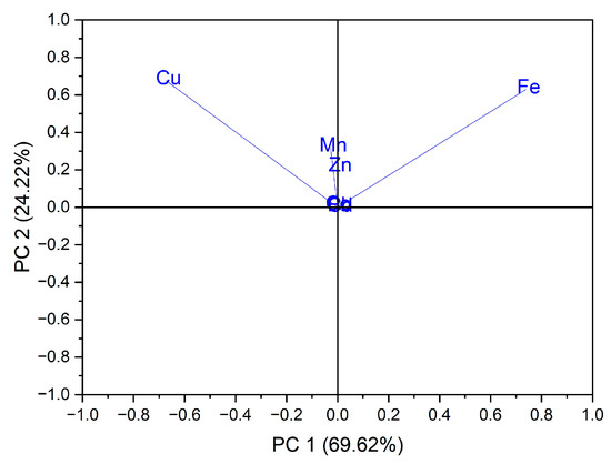 where EDI is the estimated daily dose in μg·Kg−1·day−1 and RfD is the reference dose; the RfD is: Co—20 μg·Kg−1·day−1, Cd—1 μg·Kg−1·day−1, Pb—3.57 μg·Kg−1·day−1, Zn—300 μg·Kg−1·day−1, Mn—140 μg·Kg−1·day−1, Fe—45,000 μg·Kg−1·day−1 and Cu—40 μg·Kg−1·day−1 [32,33,34,35,36,37]