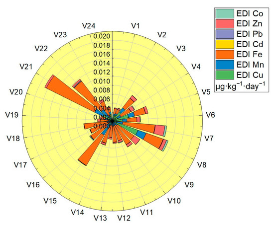 Estimated daily intake (EDI) was calculated in the case of a body weight of 70 Kg for all the assessed vegetable samples: the values obtained are shown in Table 3, and plotted in Figure 7. The EDI values obtained for the analyzed trace elements were located in the following ranges: Cu (2.89 × 10−5–6.01 × 10−3 μg·Kg−1·day−1), Mn (4.02 × 10−4–2.45 × 10−3 μg·Kg−1·day−1), Fe (8.84 × 10−4–7.94 × 10−3 μg·Kg−1·day−1), Cd (3.75 × 10−6–8.35 × 10−5 μg·Kg−1·day−1), Pb (1.07 × 10−5–1.67 × 10−4 μg·Kg−1·day−1), Zn (3.74 × 10−5–2.12 × 10−3 μg·Kg−1·day−1) and Co (2.69 × 10−5–1.24 × 10−4 μg·Kg−1·day −1). The EDI values obtained for each trace element in the vegetable samples analyzed were significantly lower than the reference values (RfD): for Cu the highest value obtained was 6.01 × 10−3 μg·Kg−1·day−1, located well below the RfDCu value—40 μg·Kg−1 ·day−1, for Mn the highest value obtained was 2.45 × 10−3 μg·Kg−1·day−1, located well below the RfDMn value—140 μg·Kg−1 ·day−1, for Fe the highest value obtained was 7.94 × 10−3 μg·Kg−1·day−1, located well below the RfDFe value—45,000 μg·Kg−1 ·day−1, for Cd the highest value obtained was 8.35 × 10−5 μg·Kg−1·day−1, located well below the RfDCd value—1 μg·Kg−1·day−1, for Pb the highest value obtained was 1.67 × 10−4 μg·Kg−1·day−1, located well below the RfDPb value—3.57 μg·Kg−1·day−1, for Zn the highest value obtained was 2.12 × 10−3 μg·Kg−1·day−1, located well below the RfDZn value—300 μg·Kg−1 ·day−1 and for Co the highest value obtained was 1.24 × 10−4 μg·Kg−1·day−1, located well below the value of RfDCo—20 μg·Kg−1·day−1 [32,33,34,35,36,37].