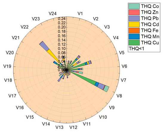 The target-hazard-quotient values (THQ) were calculated for all vegetable samples, the values obtained being presented in Table 4 and plotted in Figure 8. The THQ values obtained for the analyzed trace elements were located in the following ranges: THQCu (7.2 × 10−4–1.5 × 10−1), THQMn (2.9 × 10−3–1.2 × 10−2), THQFe (1.97 × 10−5–2.67 × 10−4), THQCd (3.57 × 10−3–8.35 × 10−2), THQPb (3.07 × 10−3–4.77 × 10−2), THQZn (1.25 × 10−4–7.07 × 10−3) și THQCo (1.34 × 10−3–1.87 × 10−2). Following the determination of the THQ, the obtained values followed the order THQCu > THQCd > THQPb > THQCo > THQMn > THQZn > THQFe.
