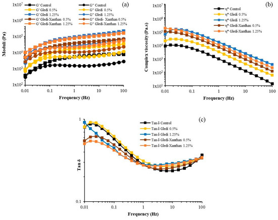 Rheograms for all studied samples. (a) Storage and loss moduli, (b) Complex viscosity, (c) tan δ.