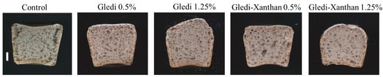 Both Gledi doses contributed to making the batter more elastically resistant and firmer before the proofing process, as shown by the rheological behavior of the macrostructure and the viscoelastic properties of the microstructure of these systems. However, the rheological properties of the macrostructure of fermented batters were similar to the fermented control sample, indicating that the changes in elastic resistance and firmness were not enough to modify the batter texture properties after the proofing process. On the other hand, the combination of Gledi-Xanthan gum resulted in more elastically resistant and firmer batters both before and after proofing. The texture properties of the unfermented batters agreed with the viscoelastic properties of their microstructure; the elastic resistance and firmness of fermented batters suggest a higher proportion of trapped gasses, indicating that Gledi-Xanthan gum would contribute to stabilizing the interface between the bubble gas and continuous aqueous phases. The Gledi-Xanthan gum combination increases the system’s viscosity by binding water, favoring the starch granules’ packing and, consequently, their Pickering stabilization effect on the bubbles gas [36]. However, the higher elastic resistance may also be related to a more resistant system to expand during proofing and baking, resulting in a compact breadcrumb at the end of the process.