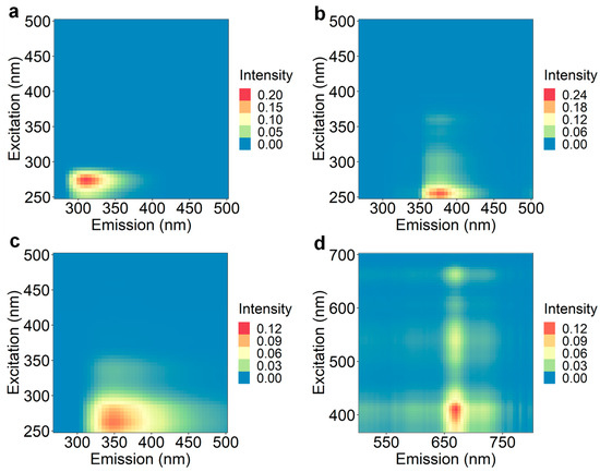 PARAFAC was applied to grape extract EEMs for exploratory analysis of the data to gain insight into the types of fluorophores that could explain the separation of different samples and relate to predictions of sensory attribute scores using the XGBoost algorithm. Two individual PARAFAC models were executed due to a low signal-to-noise ratio in the EEM region with excitation and emission greater than 500 nm. PARAFAC Model 1 included the EEM region with an excitation range of 250–500 nm and emission range of 270–500 nm (Figure 1a–c), and PARAFAC Model 2 included the excitation range of 370–700 nm and emission range of 500–800 nm (Figure 1d).