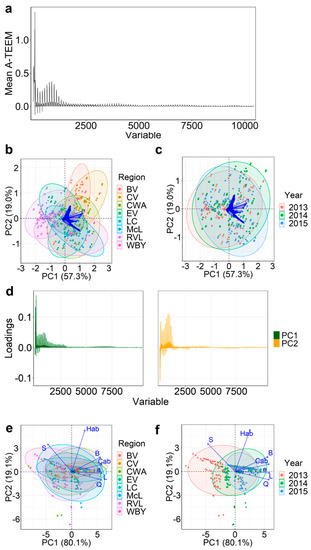 Figure 2. Absorbance-transmission and fluorescence excitation-emission matrix (A-TEEM) results showing (a) mean intensity of variable-level fused data, as well as PCA biplots showing scores and loadings on PC1 and PC2 with confidence ellipses for grape extract A-TEEM Train dataset (10,416 variables, blue arrows—labels not shown) according to (b) region and (c) year sampled, the A-TEEM variable loadings (d) on PC1 and PC2, and CIELAB Train dataset (7 variables, blue arrows) according to (e) region and (f) year sampled. Region abbreviations: BV, Barossa Valley; CV, Clare Valley; CWA, Coonawarra; EV, Eden Valley; LC, Langhorne Creek; McL, McLaren Vale; RVL, Riverland; WBY, Wrattonbully.