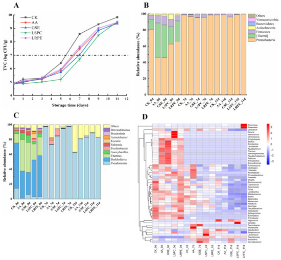 The composition and relative abundance of bacterial communities at the phylum level are shown in Figure 1B. The dominant bacteria in fresh samples of the five groups are Proteobacteria, which accounted for 80.64%, 46.21, 45.83%, 62.75%, and 66.33% in the CK, AA, GSE, LSPC, and LRPE groups, respectively. The addition of bacteriostatic substances significantly (p < 0.05) reduced the relative abundance of Proteobacteria on day 0. Among them, the antibacterial activity of GSE could be attributed to its phenolic acids, catechins and proanthocyanidins, which were confirmed to be the most potent chemicals against bacteria [31,32]. Other bacterial phyla, such as Thermales, Firmicutes, Actinobacteria, and Bacteroidetes, were identified in CK with a proportion of 12.62%, 4.90%, 1.57%, and 0.17%, respectively. The diversity of the microbiota community in refrigerated catfish fillets dropped drastically with time, and only a tiny portion of bacteria phylum engaged in the spoiling process. On days 7 and 11, the proportion of Proteobacteria in all groups reached more than 95%, followed by the Firmicutes of 0.33~4.20%. The remaining phyla were very low in abundance, including Verrucomicrobia, Fusobacteria, Chloroflexi, Cyanobacteria, Acidobacteria, Gemmatimonadetes, Chlorobi, Deferribacteres and Tenericutes (less than 0.3% of total sequences).