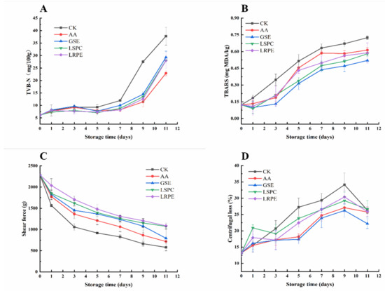 Changes in TVB-N (A), TBARS (B), centrifugal loss (C), and shear force (D) of CK-, GSE-, LSPC-, LRPE- and AA-treated catfish fillets during storage at 4 °C for the indicated times.