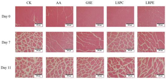 The changes of the microstructure in catfish fillets during storage are depicted in Figure 3. It was obvious that, as storage time progressed, cracks appeared in the muscle fibers of each group, and the fiber gaps widened. At the initial stage of storage, the sarcomeres of the catfish fillets treated with GSE, LSPC, and LRPE were closely arranged, and no obvious damage and breakage were found, while that of the CK and AA group were somewhat fractured, with some space between the tissues. On day 7, the integrity of the cell morphologies was better in the AA group than in the GSE, LSPC and LRPE groups, demonstrating that the addition of AA may alleviate tissue structure deterioration in catfish fillets better than in GSE, LSPC and LRPE during the middle storage period. After 11 days of storage at 4 °C, the samples in each group revealed varying degrees of fiber damage, among which CK had the most extensive damage, with cells dispersed and vacuolated, whereas the GSE, LSPC, LRPE, and AA groups displayed relatively intact histomorphology. The microstructure alterations of meat and meat products are intimately connected to their quality features, particularly water-holding capacity [41]. The retention of water in catfish fillets by polyphenols may be one of the reasons for delayed muscle fiber damage, which corresponds to the results of centrifugal loss (Figure 2D).