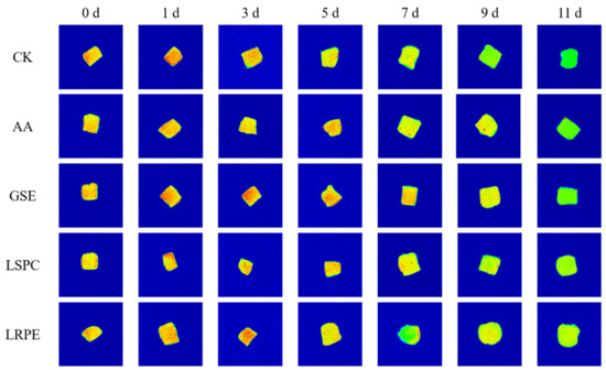 Changes in false-color image of the water proton density of CK-, GSE-, LSPC-, LRPE- and AA-treated catfish fillets during storage at 4 °C for the indicated times.