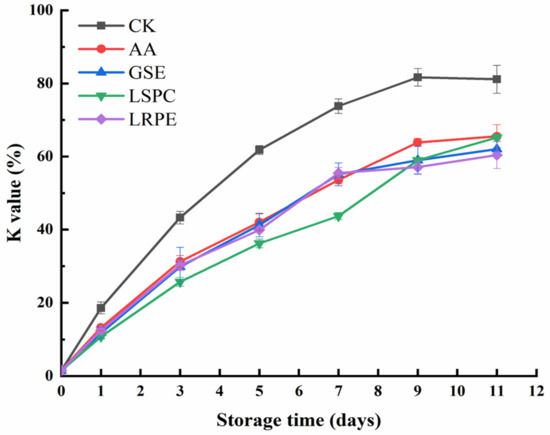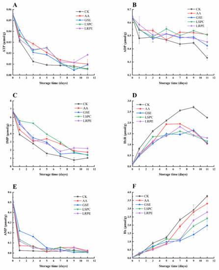 In general, ATP is degraded by autolytic breakdown, endogenous enzymes, as well as by bacterial activity, including Pseudomonas spp., S. putrefaciens, and P. phosphoreum and follows the following process: adenosine triphosphate (ATP) → adenosine diphosphate (ADP) → adenosine monophosphate (AMP) → inosine monophosphate (IMP) → and hypoxanthine riboside (HxR) → hypoxanthine (Hx) → xanthine → uric acid [45,46]. The changes in ATP-related compounds and K values are depicted in Figure 5. Regarding the changes in ATP-related compounds, the levels of IMP, HxR, and Hx varied substantially. The contents of ATP, ADP, and AMP showed a significant downward trend in the early storage period and then slowly decreased. The rapid decrease in the three ATP-related compounds during the early storage period may correspond to the expeditious degradation of ATP. The levels of ATP, ADP, and AMP in the CK were reduced by 89.95%, 48.22%, and 97.49%, respectively, at the end of storage, further confirming the degradation process of ATP. The most significant declining trend was noticed in the CK, indicating that GSE, LSPC, LRPE, and AA delayed the degradation of ATP to a certain extent.