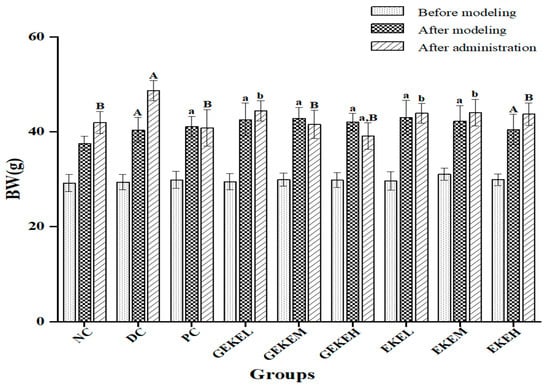 STZ-induced diabetic mice were treated with EKE or GEKE at three concentrations for four weeks (Table 1). Because diabetes is closely associated with obesity, the weight of the mice was recorded during treatment (Figure 1). The weight of the STZ-treated mice had increased compared to the NC control. After 4 weeks of treatment, the body weight of NC, PC, GEKEM, GEKEH, and EKEH groups was lower than that of the diabetes control group (p < 0.01). The body weight of animals in the PC, GEKEM, and GEKEH groups after treatment was even lower than before treatment. In addition, the body weight of the GEKEL, EKEL, and EKEM groups was significantly reduced compared to the DC group (p < 0.05). We observed that the GEKE group was performing significantly better than the EKE group in terms of anti-obesity symptoms of type 2 diabetes. The weight of the GEKEM group was similar to that of the NC group after treatment. The GEKEH group resulted in outstanding improvement effects, and the weight loss effect of these animals was even better than the metformin hydrochloride treatment group (PC group).