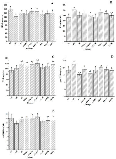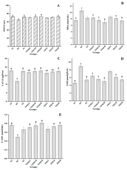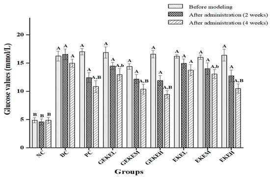 According to Figure 2 and Table 5, both the EKE group and the GEKE group showed dose-dependent improvement in hyperglycemia symptoms. The higher the dose of the same drug, the better the hypoglycemic ability. The therapeutic effect of the EKE treatment was not as good as that of GEKE, but the therapeutic effect of EKEH was similar to that of GEKEM, and the hypoglycemic effect of GEKEH treatment was far better than that of EKEH.