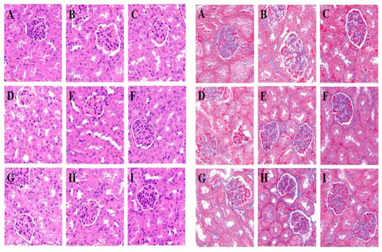 HE (left) and Masson (right) stained sections of mice kidneys. (A–I) show the kidney tissues of NC, DC, PC, GEKEL, GEKEM, GEKEH, EKEL, EKEM, and EKEH groups, respectively.