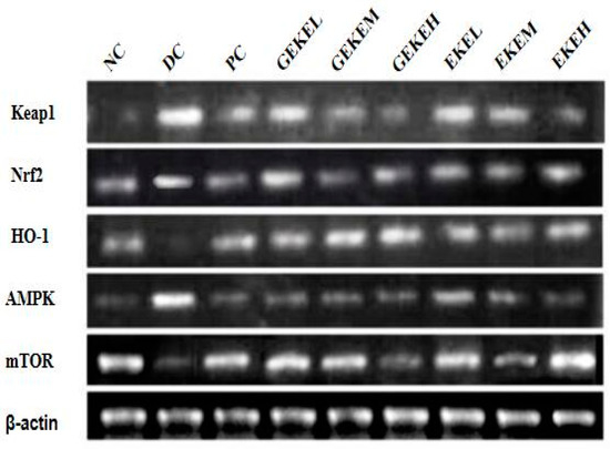 To explore the molecular mechanism of EKE and GEKE treatment on nephropathy in diabetic mice, the transcript levels of various genes were determined in kidney homogenate. As shown in Figure 5, the RT-PCR results show that the expression of important genes involved in the AMPK/mTOR and Keap1/Nrf2/HO-1 signaling pathways, keap1, nrf2, and ampk, was significantly increased in the DC group compared with NC, while the expression of transcripts coding for HO-1 and mTOR was significantly decreased in DC. Following intervention with different doses of GEKE or EKE, these gene expression levels responded to different degrees. The mRNA levels of transcripts for Nrf2, HO-1, and mTOR were increased as a result of treatment, while the transcription levels of Keap1 and AMPK were decreased. The gene expression level gradually shifted towards that of the NC group with an increase in treatment dose.