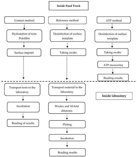 The specifics of catering production make it difficult or even impossible to apply the same control methods in catering establishments as those applied in food industry facilities. In order to make control effective, a systematic approach and the prevention of hazards are essential. As other authors [96,97] point out, even very detailed controls of sanitary inspections are only a fraction of the operations carried out in catering establishments and will not prevent the risk of foodborne diseases. Routine inspections are difficult to conduct in food trucks because of the constant movement of facilities and the frequent change in the range of activities. Traditional microbiological methods for the detection and quantification of microorganisms on surfaces and equipment, which require culture and incubation, are not a good option in this case, as they are time-consuming and do not provide an immediate evaluation of the current state of hygiene in an establishment. In addition, food consumption takes place immediately after production, and it is pointless to obtain a result after this time. In the case of food trucks, preventive measures seem to be a more appropriate solution.
