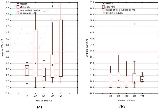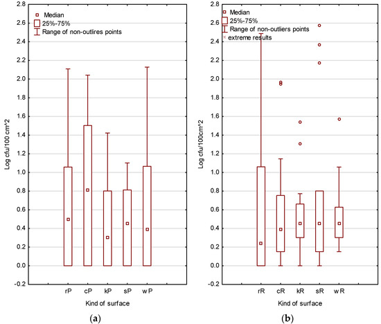 Results obtained from the surfaces of refrigerators (rP, rR), cutting boards (cP, cR), knives (kP, kR), and serving (sP, sR) and working boards (wP, wR) from 20 food truck outlets varied significantly; p < 0.05 (Figure 2a,b; Table S1, Supplementary Material).