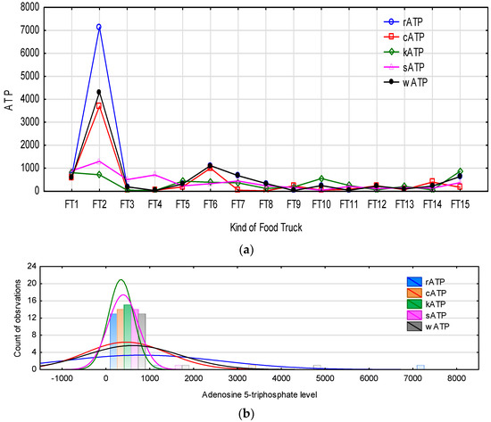The indirect method of hygiene evaluation using the measurement of adenosine 5-triphosphate levels is one of the fastest measurement methods compared to culture methods, with results obtained in just a few minutes. Therefore, an experiment was carried out to correlate the results so obtained with those from culture methods. The metabolite that is analysed is generated from the decomposition of a high-energy compound contained in microbial and eukaryotic cells. The result obtained is directly proportional to the level of ATP content of microbial and organic sources. Figure 4 shows a characterisation of the level of ATP occurrence on the food truck outlet surfaces studied. On 25% of the examined surfaces, the RLU level exceeded the tolerance value by more than 500 RLU/100 cm2. With the exception of FT2, ATP was found on all of the tested surfaces in the range of 0–1000 RLU (Relative Light Unit) (Figure 4a,b). In the case of the exception of food truck outlet FT2, ATP levels in the range of 4000–7000 RLU were found on the refrigerator and on working and cutting board areas, which significantly affected the distribution of values of the results obtained (Figure 4b).