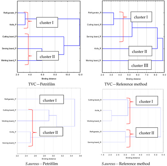 The cluster analysis that was conducted allows quick identification of clean and contaminated surfaces. Furthermore, it reveals differences in surface contamination depending on the analysis method used. In the case of TVC, the knife and cutting board surfaces show the greatest variation depending on the method. Due to the difficulty of making an imprint with the Petrifilm test on the knife surface, it can be presumed that the swabbing method is better for sampling small equipment, and the result is more accurate. In the case of the cutting board, due to the porosity of the material, the direct agar imprint method from the surface proved to be more effective in sampling.