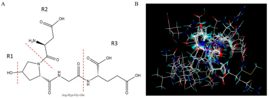 Establishment of 3D-QSAR model. (A) The common skeleton OG(PG) and R1, R2, R3 groups. (B) Molecular alignment of 23 antiplatelet peptides.
