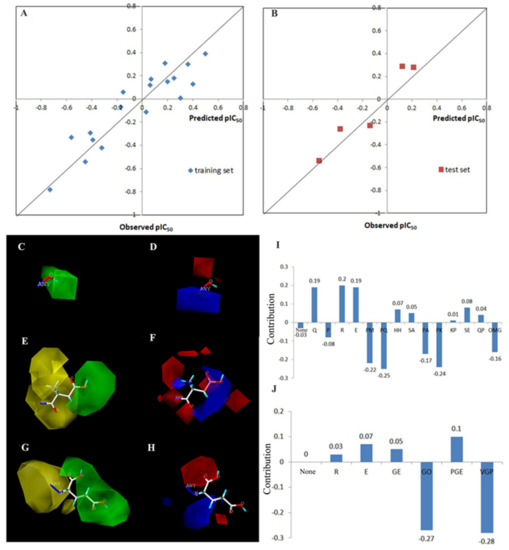The 3D-QSAR model established by Topomer CoMFA. Plots of predicted values of pIC50 versus actual values for (A) training set (r2 = 0.862) and (B) test set (r2 = 0.930) of antiplatelet peptides using the Topomer CoMFA model. (C-H) Steric and Electrostatic Contribution maps for tetrapeptides ROGE by Topomer CoMFA analysis. The color of ROGE molecular diagram: White-C, Blue-N, Aquamarine-H, Red-O, Yellow-S. ANY: The sites where the R groups are introduced to the PG common skeleton. (C) Steric Contribution map of R1 group. (D) Electrostatic Contribution map of R1 group. (E) Steric Contribution map of R2 group. (F) Electrostatic Contribution map of R2 group. (G) Steric Contribution map of R3 group. (H) Electrostatic Contribution map of R3 group. (I) Total Contribution of C-terminal amino acid residues. (J) Total Contribution of N-terminal amino acid residues.