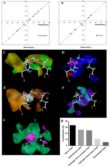 The 3D-QSAR model established by CoMSIA. (A,B) Plots of predicted values of pIC50 versus actual values for training set (r2 = 0.999) and test set (r2 = 0.999) of antiplatelet peptides using the CoMSIA model. (C–G) 3D contour plots of the peptide ROGE of the QSAR model using CoMSIA analysis. (C) Steric field; (D) electrostatic field; (E) hydrophobic field; (F) hydrogen bond donor field; (G) hydrogen bond acceptor field. (H) Total Contribution of different fields.