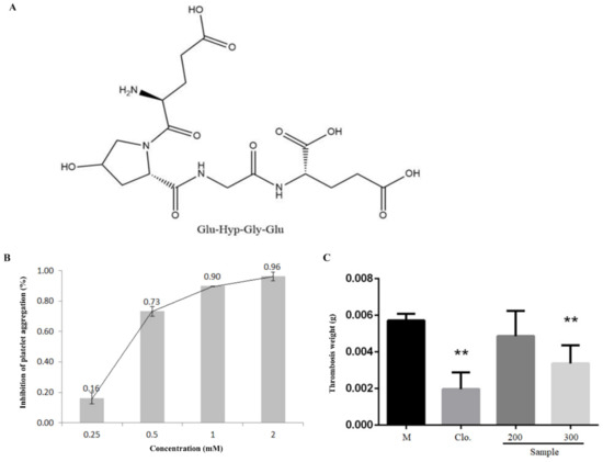 Peptide EOGE exhibited antiplatelet activity in vitro and prevented ferric chloride-induced arterial thrombosis in vivo. (A) Chemical structures of peptide EOGE. (B) Antiplatelet effect of peptide EOGE induced by ADP. (C) Effects of peptide EGOE on ferric chloride-induced arterial thrombosis model in rats, with clopidogrel as positive control. Male Sprague Dawley rats were orally administrated with 0.9% saline, clopidogrel, EGOE at different doses (μmol/kg b.w.), respectively. ** indicates p < 0.01 as compared to the M group (n = 6).