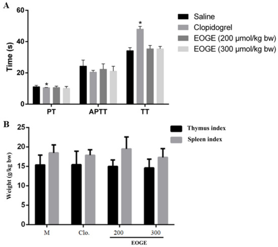 Effects of EOGE on (A) PT, APTT, and TT, and (B) thymus index and spleen index in rats. Male Sprague Dawley rats were orally administrated with 0.9% saline, clopidogrel, EGOE at different doses (μmol/kg b.w.), respectively. * indicates p < 0.05 as compared to the M group (n = 6).