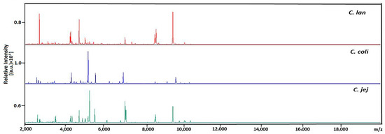 Characteristic spectra of C. jejuni, C. coli and C. lanienae isolates generated by the Bruker Ultraflextreme MALDI TOF system. The intensities and m/z of the ions are shown on the Y- and X-axis, respectively.