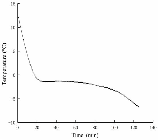 Beef samples of 5 × 5 × 5 cm were taken to remove visible fat and connective tissue [21]. The metal probe of the temperature recorder was inserted into the center of the beef sample and put into the refrigerator at −18 °C. The temperature of the sample was measured every 10 s to draw the freezing curve of the beef sample.