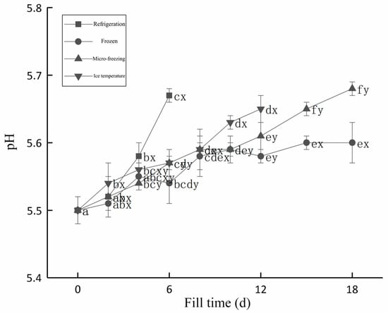 The pH change of the beef during storage is shown in Figure 2. Figure 2 showed that the pH values in the beef for the four storage methods were on the rise, this was due to the process of microorganisms and enzymes causing the protein to decompose during meat storage, and due to nitrogenous compounds generating alkaline substances. So, with the increase of storage time, the pH of the beef would keep rising.