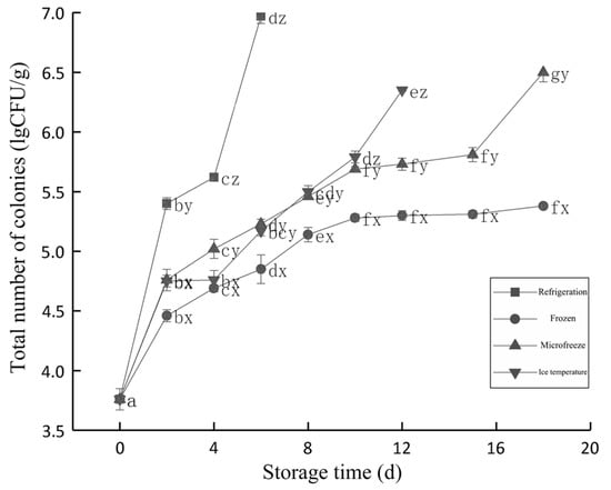 Changes in the total number of colonies in the beef storage with different low-temperature storage methods. d, day.