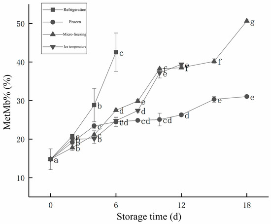 The variation of MetMb% of the beef with different low-temperature storage methods during storage is shown in Figure 5. As can be seen from Figure 5, the MetMb% of beef in the four storage methods showed an increasing trend with the increase of storage time. The MetMb% was related to the freshness of beef, the higher the relative content, the lower the freshness of beef. When MetMb% was lower than 40%, the meat color of beef was better and it was more acceptable to consumers. The MetMb% of fresh beef was the lowest (14.80%), while that of the refrigeration group was over 40% (42.54%) after 6 days of storage. The meat color became worse, which affected the sale of beef. The MetMb% of beef stored in micro-freezing, reached 50.66% and exceeded 40% at 18 d of storage. Under ice temperature storage, beef was still less than 40% (39.41%) after 12 d of storage. The MetMb% of the frozen group was only 31.04% after 18 d of storage, which was better than the other three groups, in terms of the MetMb% of the stored beef.
