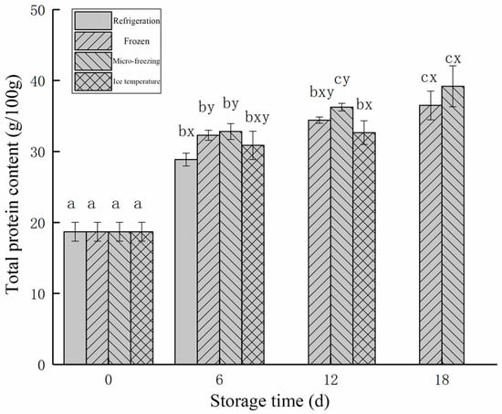 The changes in the total protein are shown in Figure 6. The total protein content of the four groups increased with the increase of storage time. The total protein content of fresh beef was 18.685 g/100 g. At 6 d of storage, the total protein content of beef in refrigeration storage was the least, at 28.862 g/100 g. The total protein content was significantly lower than 32.286 g/100 g in the frozen group and 32.816 g/100 g in the micro-frozen group, while there was no significant difference with the beef stored at ice temperature for 6 d of storage. During the whole 18 d of storage, the total protein content of the micro-frozen group was always the highest, but there was no significant difference between the micro-frozen group and the frozen group.