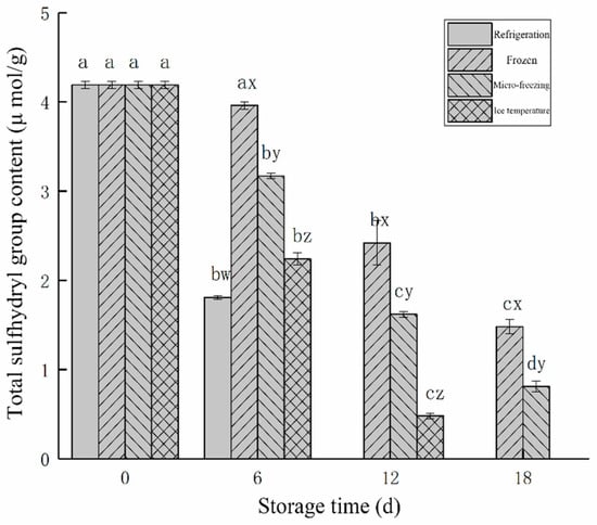 The changes of the total sulfhydryl content in beef in different low-temperature storage methods during storage are shown in Figure 7. The total sulfhydryl content of beef under four different storage modes showed a downward trend. The sulfhydryl content of myosin and actin, which constitute myofibrillar, decreased with the increase of storage time in the oxidation reaction, so the change of total sulfhydryl content of beef represented the oxidation degree of protein.