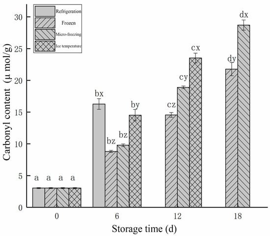 Changes of carbonyl content in beef stored in different low-temperature storage methods. d, day.