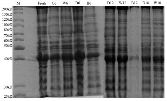 Effect of the SDS-PAGE profile of beef myofibril stored in different low-temperature storage methods. M: marker, fresh: fresh beef, C6: refrigeration 6 d beef, W6: 6 d micro-frozen beef, D6: 6 d frozen beef, B6: 6 d ice temperature beef, D12: 12 d frozen beef, W12: 12 d micro-frozen beef, B12: 12 d ice temperature beef, D18: 18 d frozen beef, W18: 18 d micro-frozen beef.