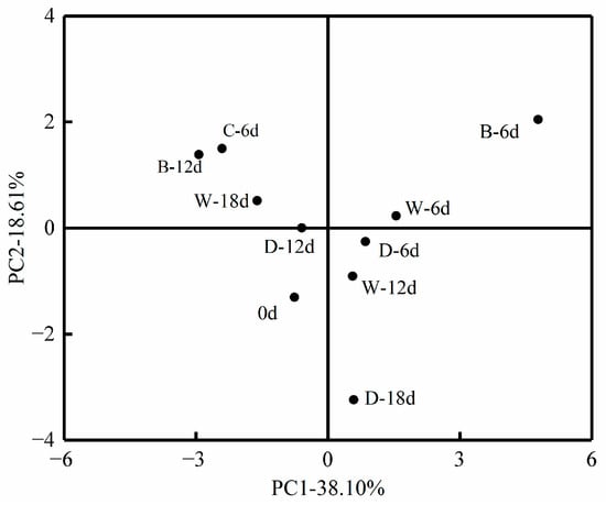 Thirteen key flavor substances (OAV ≥ 1) of beef under different low-temperature storage methods and different storage times were analyzed by PCA analysis. The contribution rates of each principal component to flavor are shown in Table S8, and the contribution rates of the first four principal components were 38.10%, 18.61%, 13.83%, and 10.51%, respectively. The cumulative contribution rate had reached 81.07%. The PCA analysis can be satisfied by extracting only the principal components containing more than 80% of the information.