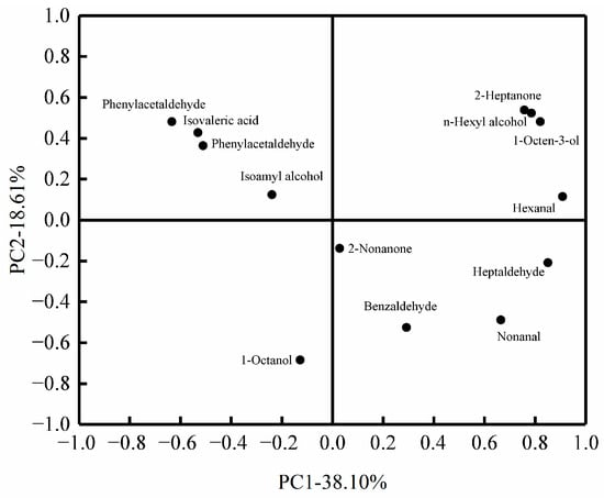 Principal component loading diagram of key flavor compounds in beef under different low-temperature storage methods.