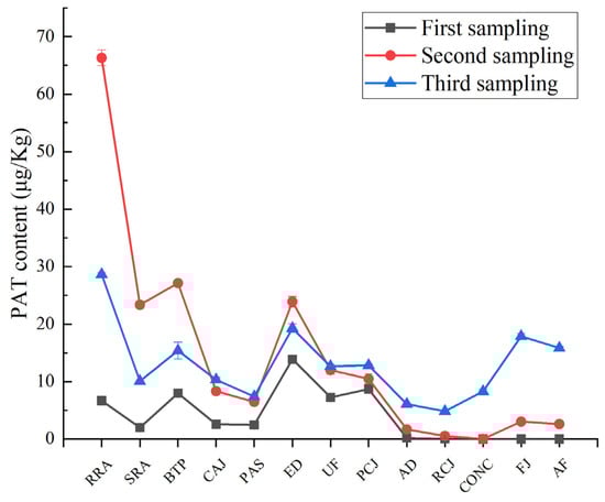 PAT content changes in three samplings. Abbreviations: RRA—receipt of raw apples. SRA—sorting of raw apples. BTP—belt-type pressing. CAJ—cloudy apple juice. PAS—pasteurization. ED—enzymatic digestion. UF—ultrafiltration. PCJ—pre-clear juice. AD—adsorption. RCJ—rear-clear juice. CONC—concentration. FJ—finished juice. AF—aseptic filling.