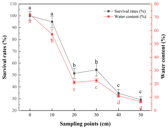 The survival rate decreased with decreasing moisture content (Figure 1). The initial moisture content was 72.14% (0 cm) and decreased to 66.34%, 21.10%, 22.56%, 11.04% and 6.77% at 10, 20, 30, 40 and 50 cm, respectively. The corresponding survival rates were 94.96%, 51.31%, 54.36%, 34.60% and 29.17%. The samples at 20 cm were the first point where survival significantly decreased, and there was no significant change (p > 0.05) in the survival rate between 20 cm and 30 cm. There was also no significant change (p > 0.05) in the survival rate between 40 cm and 50 cm. The sample at 50 cm was the final product of spray-dried bacteria, which was more convenient for sampling, so the samples at 20 cm and 50 cm were selected as the sampling points for proteomic analysis.