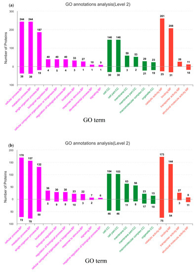 The GO analysis indicated enrichment of the pathways, including DNA-dependent ATPase activity, nucleotide binding, nucleoside phosphate binding, ATP binding, adenyl ribonucleotide binding, ATPase activity and coupled and small molecule binding in the 20 cm samples (p < 0.01, Figure 3a). Thus, most changes were related to DNA replication and repair. Proteins related to metal ion transport and integral and intrinsic membrane components were enriched in the 50 cm samples (p < 0.001, Figure 3b). Thus, most changes were related to membranes and transport. DEPs related to the transport of potassium, calcium and magnesium ions were particularly enriched.