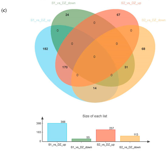 GO analysis of DEPs. (a) GO analysis of DEPs at the 20 cm sampling point. (b) GO analysis of DEPs at the 50 cm sampling point. (c) Venn diagram comparing up- and down-regulated proteins. (a,b): column represents GO classification with annotation of secondary GO classifications of proteins shown by the direction of the bar. Height represents the number of proteins in the secondary classification. Abscissa represents the GO second-level classification terms. The abscissa represented the GO second-level classification terms. (c): S1_vs_DZ_up: proteins up-regulated at the 20 cm sampling point; S1_vs_DZ_down: proteins down-regulated at the 20 cm sampling point; S2_vs_DZ_up: proteins up-regulated at the 50 cm sampling point; S2_vs_DZ_down: proteins down-regulated at the 50 cm sampling point.