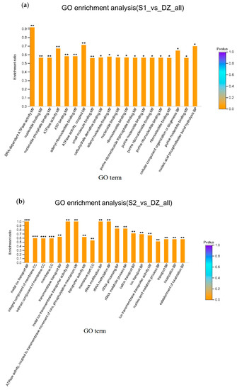GO functional enrichment analysis of DEPs. (a) GO functional enrichment analysis of DEPs at the 20 cm sampling point. (b) GO functional enrichment analysis of DEPs at the 50 cm sampling point. S1_vs_DZ_all: proteins at the 20 cm sampling point; S2_vs_DZ_all: proteins at the 50 cm sampling point. Abscissa: GO term; ordinate: enrichment rate. The ratio of the number of proteins enriched in the GO term: background number annotated by the GO term is shown. The color gradient of the column indicates the significance of enrichment; p < 0.05: *; p < 0.01: **; p < 0.001: ***.