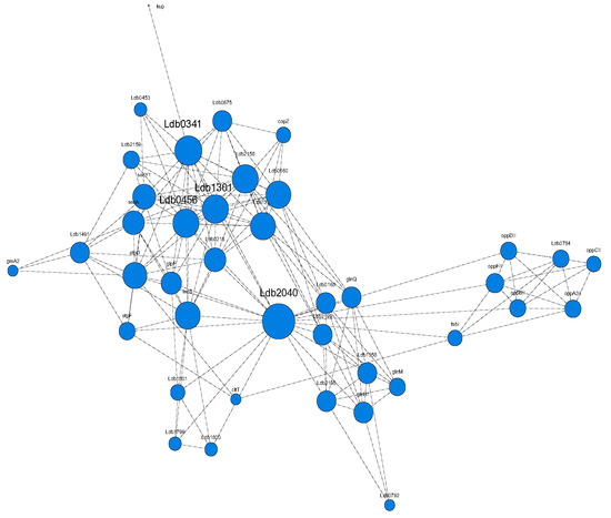 A PPI network of interactions among differently expressed transport proteins was constructed. Ldb2040 (PTS fructose transporter subunit IIC), Ldb0341 (magnesium-translocating P-type ATPase), Ldb1301 (metal ABC transporter ATPase) and Ldb0456 (calcium-transporting ATPase) showed a high degree of connectivity to other proteins (Figure 4).