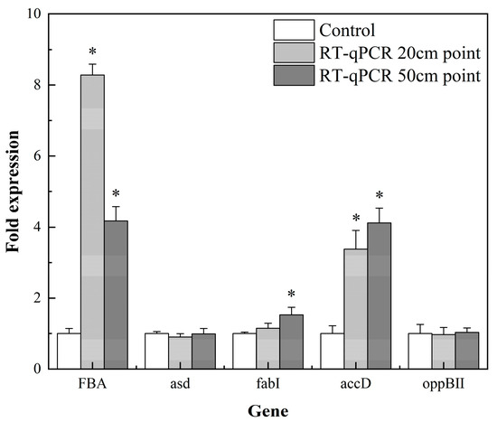 The GO pathway genes including accD, FabI, FBA, asd and oppBII were assessed with RT qPCR to verify the TMT results (Figure 5). The genes accD, FabI, FBA and oppBII were expressed in concordance with the protein abundance while asd expression was inconsistent with the protein abundance in the 20 cm samples. Expression levels of asd, FabI and accD agreed with the proteomics results, but FBA and oppBII did not in the 50 cm samples.