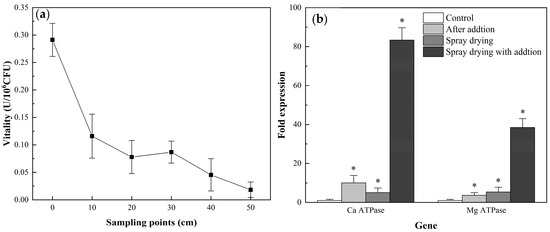 When L. bulgaricus sp1.1 was cultured in MRSC or MRSM for 12 h to regulate the expression of Ca++/Mg++ ATPase, it was found that the addition of CaCl2 or MgCl2 increased the expression of ATPase related genes (Figure 6b). The expression of calcium-transporting ATPase related genes increased 10.07-fold, and the expression of magnesium-translocating P-type ATPase related genes increased 3.65-fold. Ca++/Mg++ ATPase activity increased from 0.29 U (control) to 0.392 U (MRSC) or 0.389 U (MRSM; Figure 6c). After spray drying (50 cm sampling point), the activities of Ca++/Mg++ ATPase were significantly higher (p < 0.05) than controls (0 cm sampling point). Expressions of calcium-transporting ATPase related genes were increased 83.33-fold and that of magnesium-translocating P-type ATPase related genes were increased 38.5-fold.