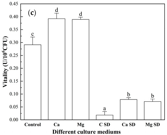 Following the elevation of intracellular calcium and magnesium ion concentrations, the survival rates after spray drying were 43.06% and 42.64%, respectively. These values were 13.89% and 13.47% higher than the survival rates of the controls (Figure 7b).